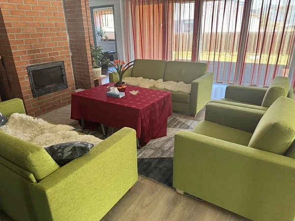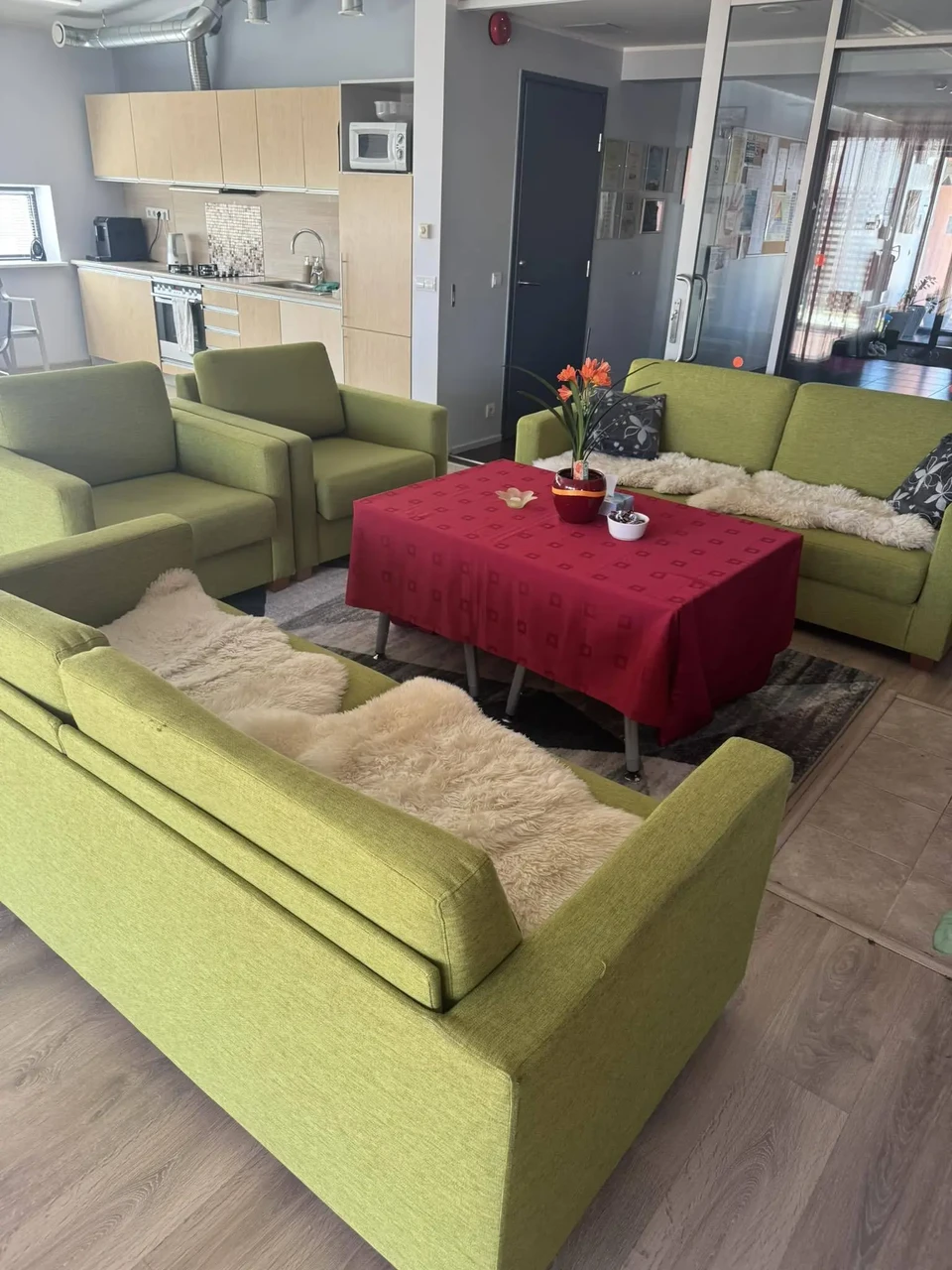 Koosolekute ruumis on nüüd kaks diivanit ja kaks tugitooli. Varasemalt toimusid koosolekud söögilaua taga pinkidel istudes, kuid nüüd on võimalik perevanematega arutada erinevaid teemasid hubaselt kamina ees. Selline keskkond toetab töötajate heaolu ning aitab pingelisi olukordi rahulikumalt lahendada.